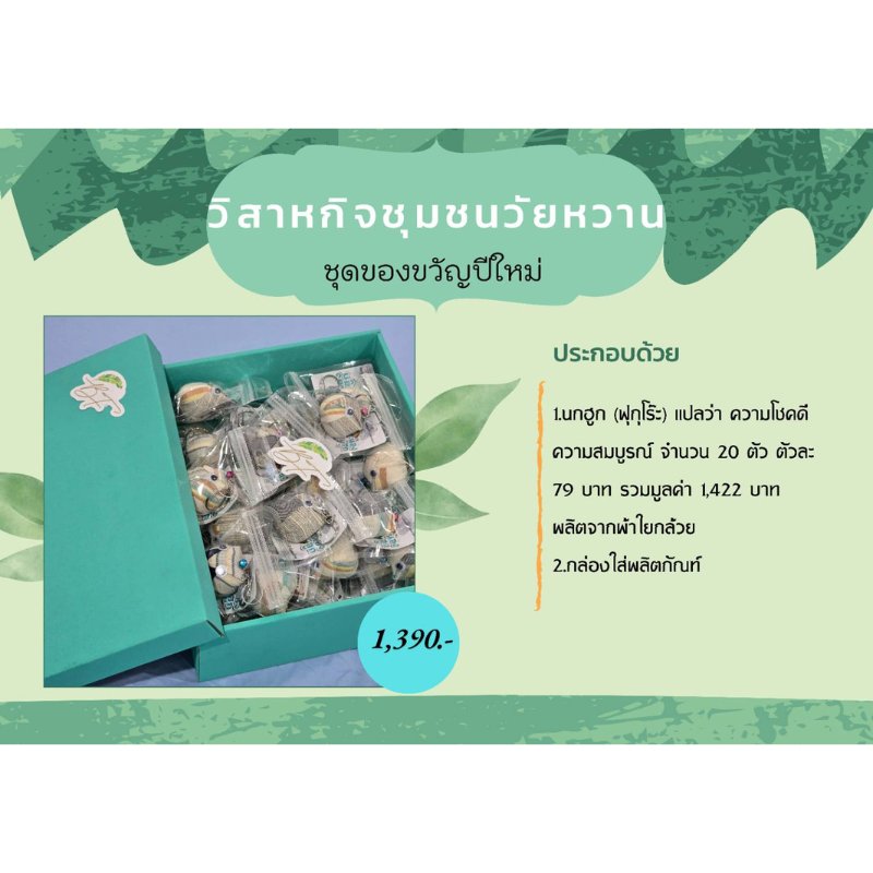 ประกอบด้วย ตุ๊กตานกฮูกทำมือ 20 ตัว (สื่อถึงปัญญาและโชคดี) ผลิตจาก ผ้าใยกล้วย งานแฮนด์เมดประณีตจากชุมชน พร้อม กล่องของขวัญ